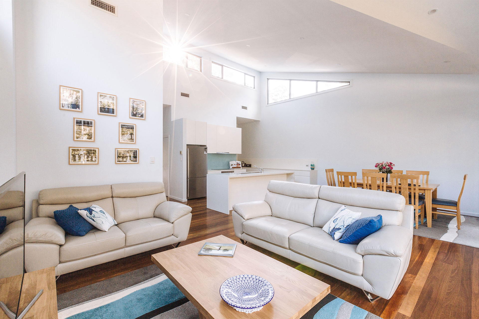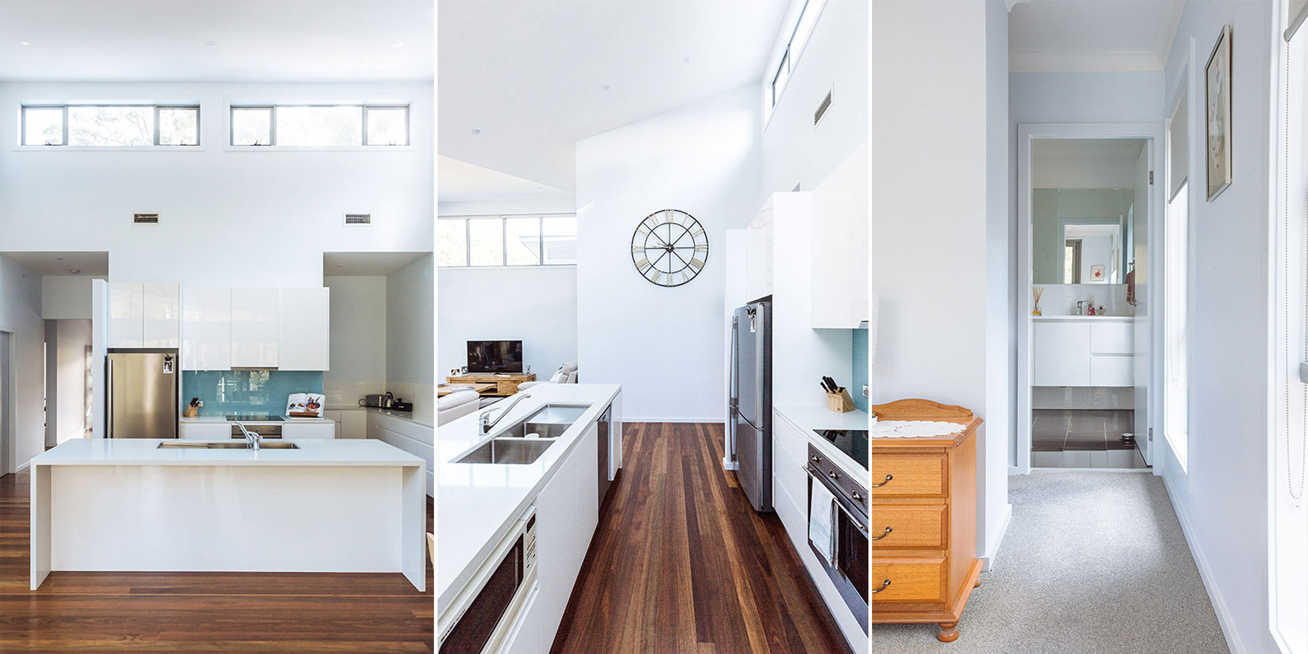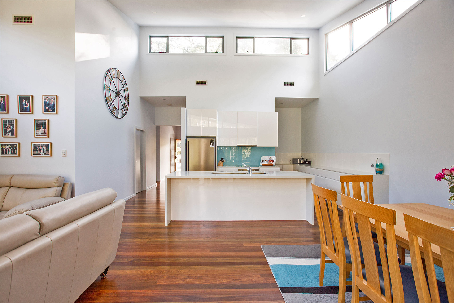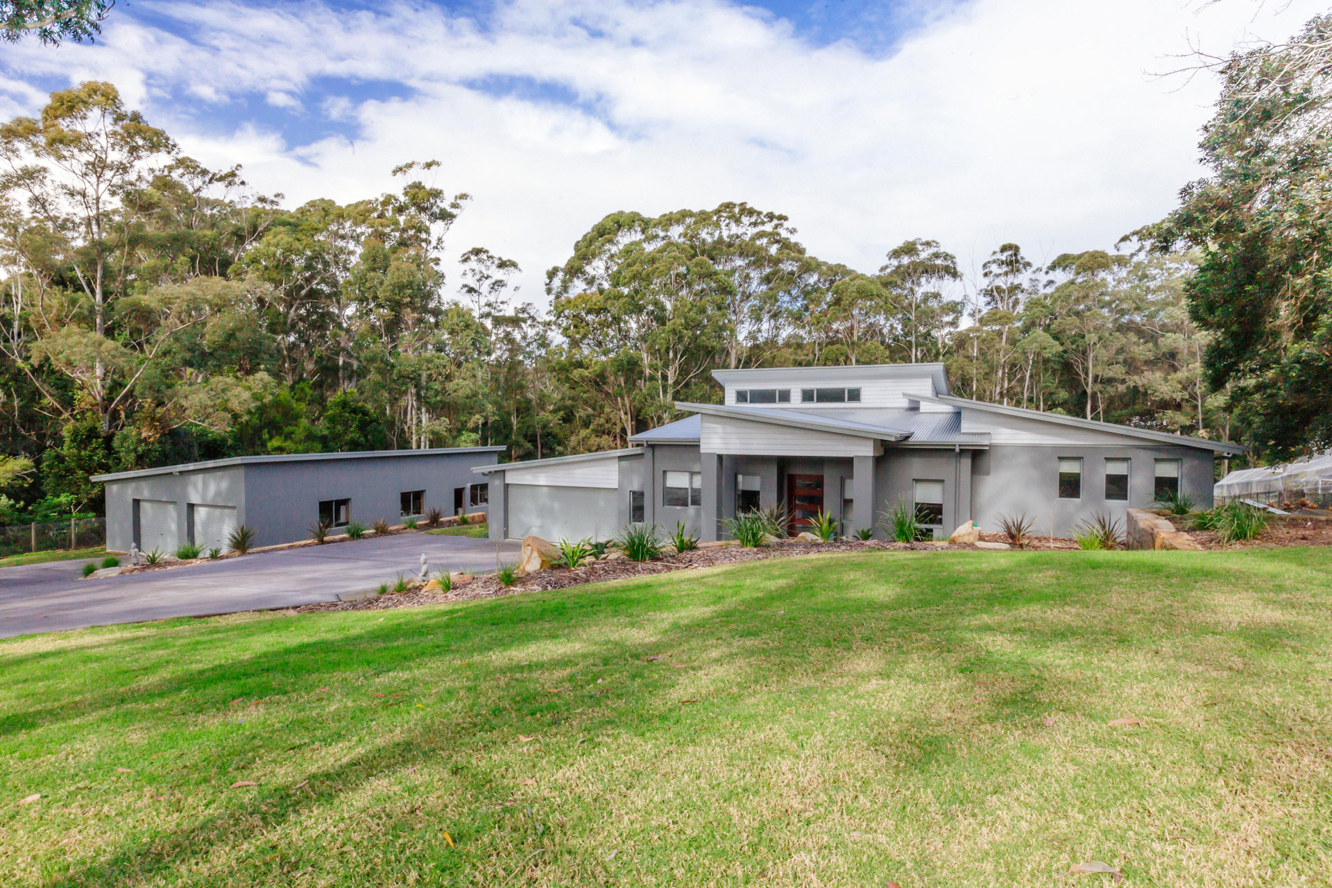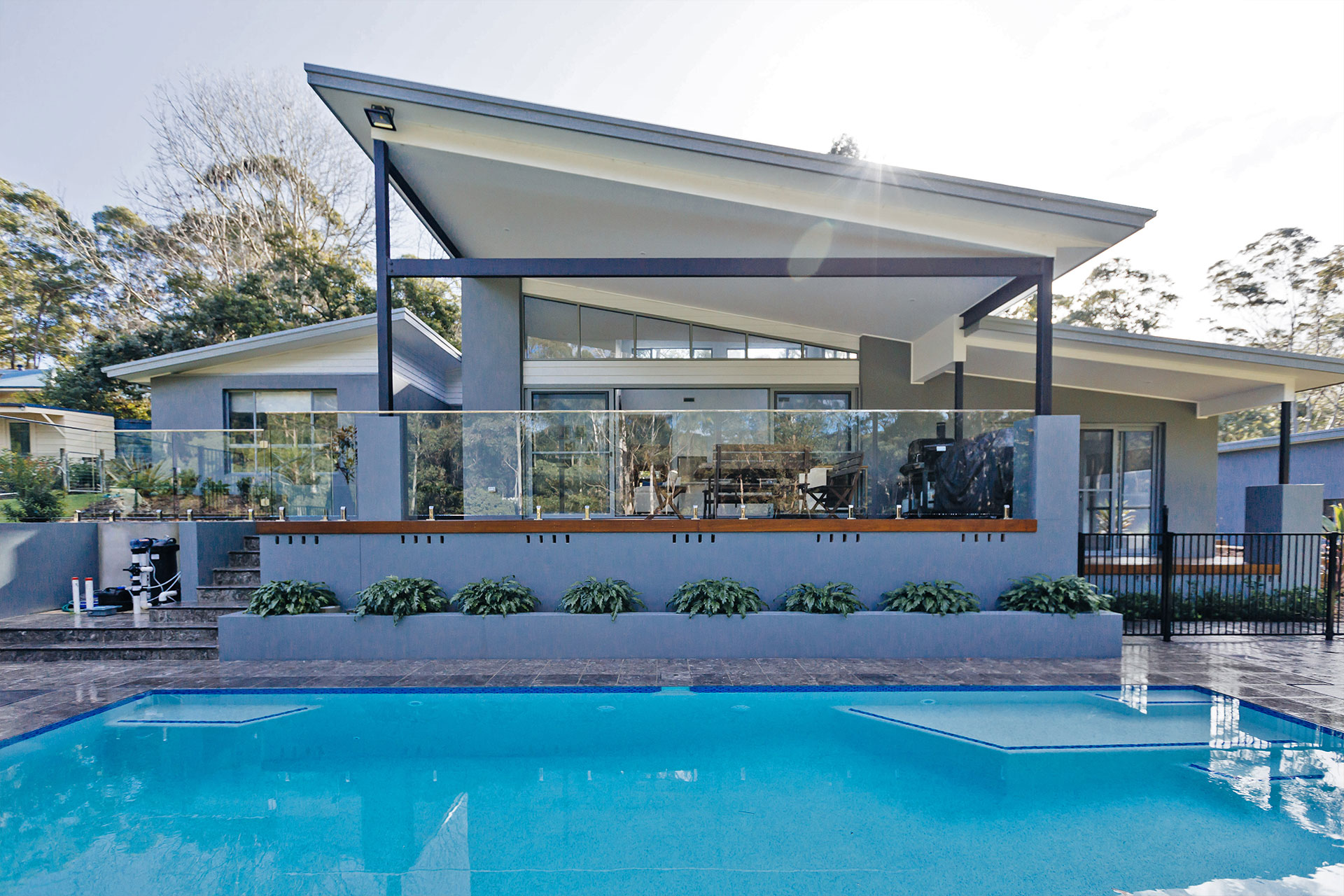 Designed by Etchells Building Design, this new home is a custom-designed, modern take on a rural home. Set on acreage in Kincumber, the home is designed to step down a sloping site while taking advantage of stunning views to the south. Highlight windows placed on the northern side of the home ensure there is plenty of natural light which can be incorporated into a passive design. Open plan living, separate wings for parents and children, a stylish pool terrace and integrated landscaping make this an impressive home.