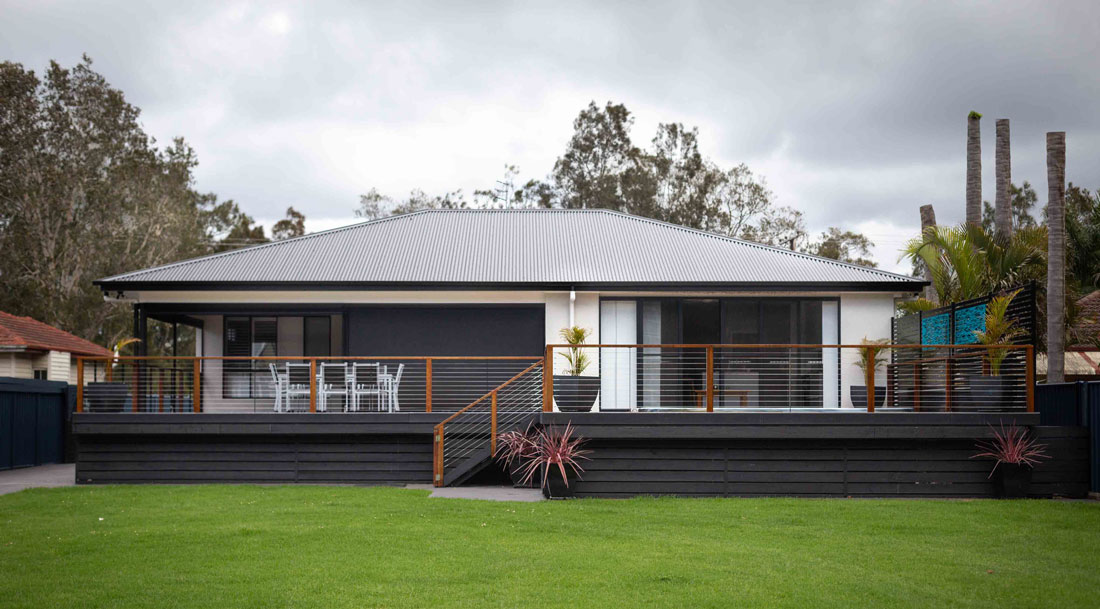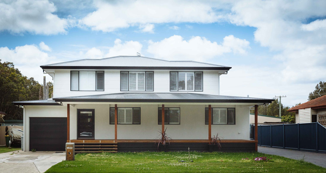This new two storey home on a large block in Tacoma features clean, modern and symmetrical lines. There is a focus on outdoor living with a large back deck for entertaining that also includes space for a generously sized spa. The combination of white, slate grey and quality timbers creates stylish and timeless curb appeal.